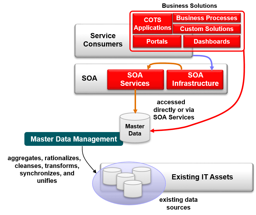 The synergy of MDM and SOA lies in the focus of each strategy. Where SOA defines a modular approach to solution engineering where SOA Services encapsulate reusable functionality and access to data, MDM provides quality data to operate on or expose. MDM enhances the value of SOA by establishing a clean, unified, master source of data. As SOA Services are leveraged beyond application silos and departmental boundaries, their applicability and integrity depend on the establishment of a consistent and universally accepted source of data.