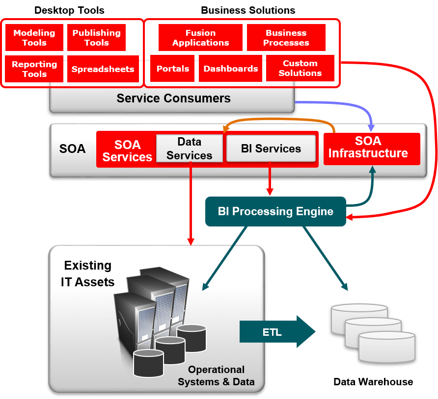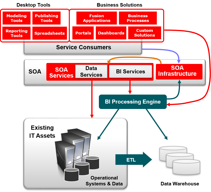• The BI processing engine may access data through a variety of means including direct access to operational systems and data warehouses as well as SOA Services exposed via SOA infrastructure.